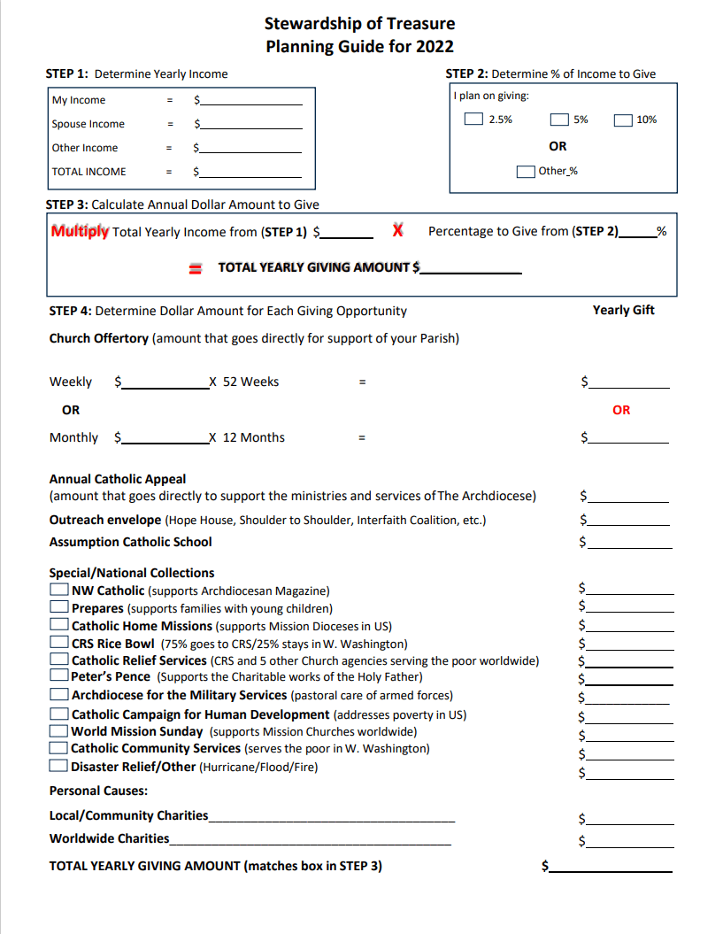 On a very practical note, we have provided worksheets for you this weekend so that you can be deliberate and intentional about giving your money away. Figure out your income from your last tax statement. Choose a percentage. I would aim for 5% if you need a starting point. Multiply those numbers together and you will see how much money you should give away this year. Then go through and assign that money to all the different causes that we talk about throughout the year. Once the worksheet is complete, you do not have to think about tithing for the rest of the year. When a cause comes up, just reference the worksheet to see the decision you have already made. As a final step, it is helpful for the parish to know how much money you have designated for us next year, so please also fill out and return your pledge cards, either by dropping them in the collection basket or mailing them to the office.