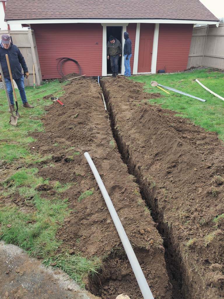 Almost three years after they (under the leadership of Jack King) straightened the garage for the Ellis St. house to keep it from collapsing, the Knights of Columbus were on Saturday to run electricity to that same garage. It involved digging a giant trench through my back yard. Thank you to Bob Grasher for his leadership and to everyone who showed up to help him!