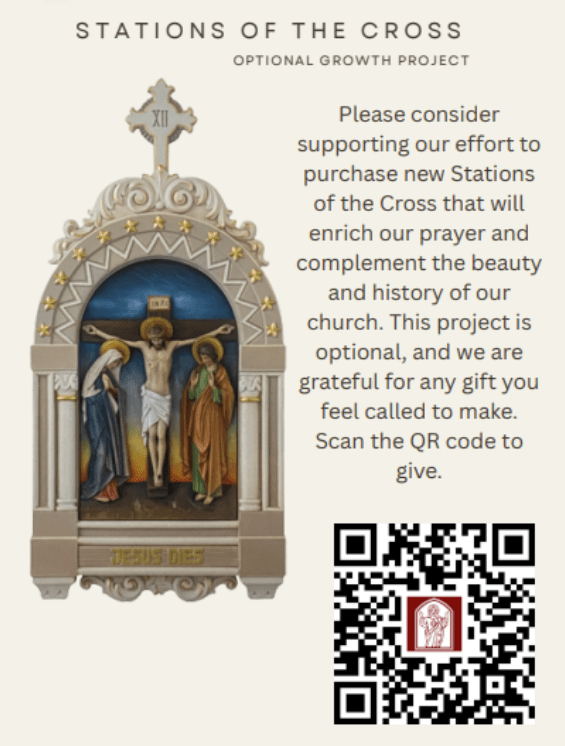 Which brings me to the Stations of the Cross. Though the new Stations were chosen to match the architecture of our church, I have heard concerns that they are small and monochrome, making it difficult to see the scenes depicted. I have also heard a sense of unease about how the new stations were introduced, without a clear explanation for the change. To resolve these concerns, I asked our Arts and Environment Committee to consider our previous Stations (which the current owners have generously offered to return), our current Stations, and any other Stations that might be available on the market, and to make a recommendation to me. After thoughtful discussion and research, the Committee has recommended purchasing new Stations from Italy which are architecturally consistent with the church and which vividly display the scenes of the Passion.
