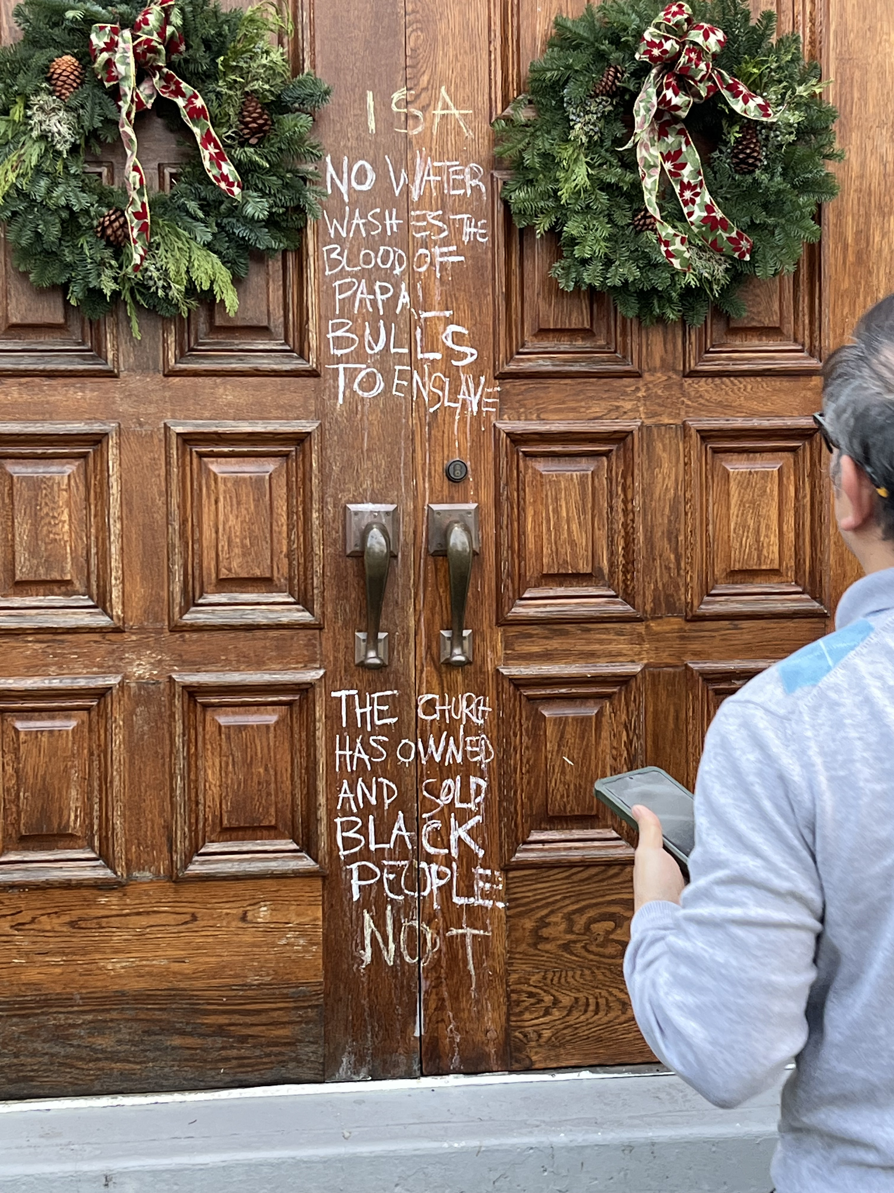 Regarding the relationship of the Church to the slave trade, mentioned in this graffiti, I find this article supremely helpful: https://www.ewtn.com/catholicism/library/popes-and-slavery-setting-the-record-straight-1119