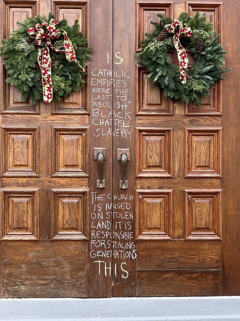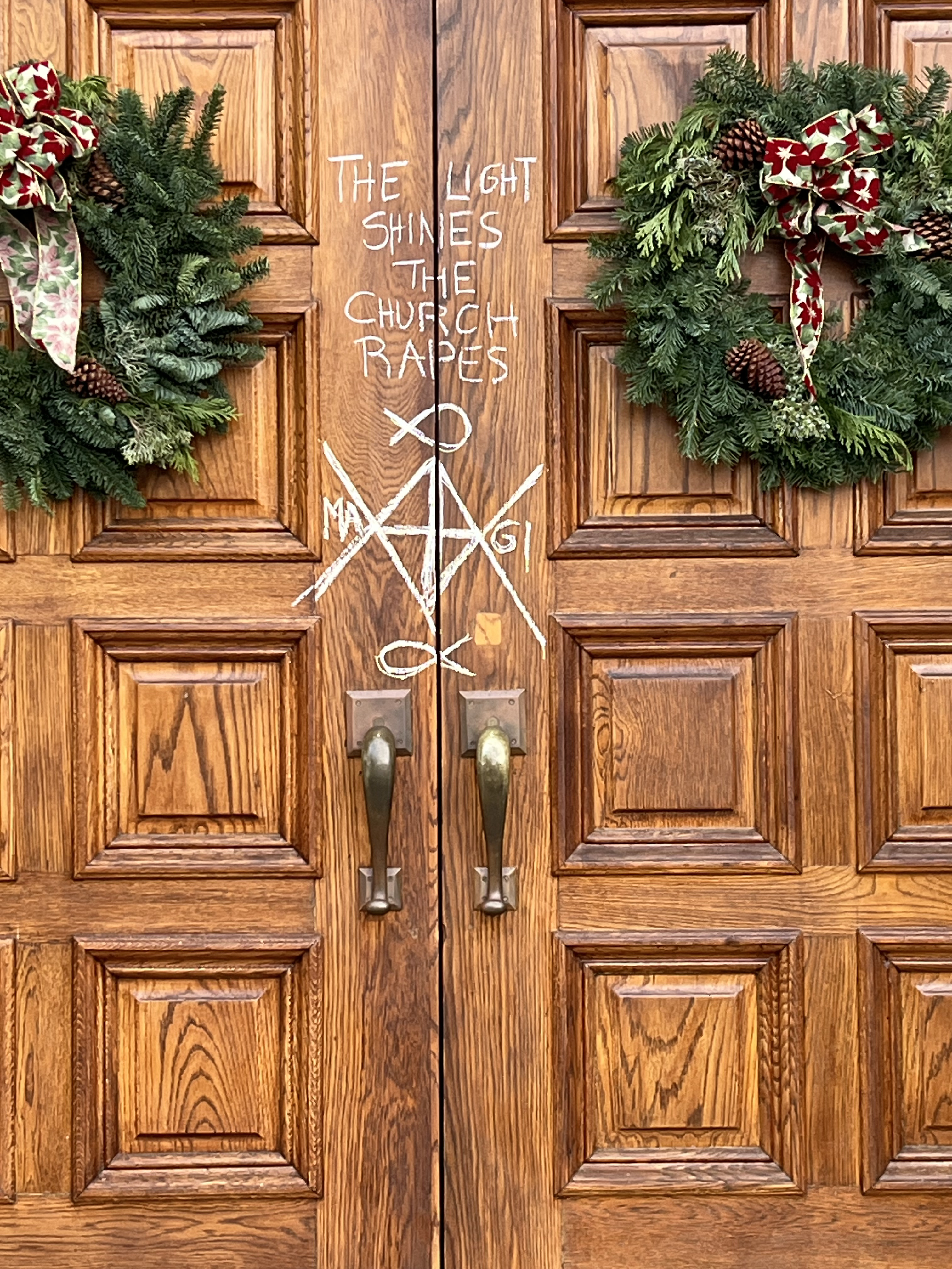 Apparently, this homily was more controversial than I expected. Sometime later on Sunday, the Church of the Assumption was vandalized with Epiphany chalk.